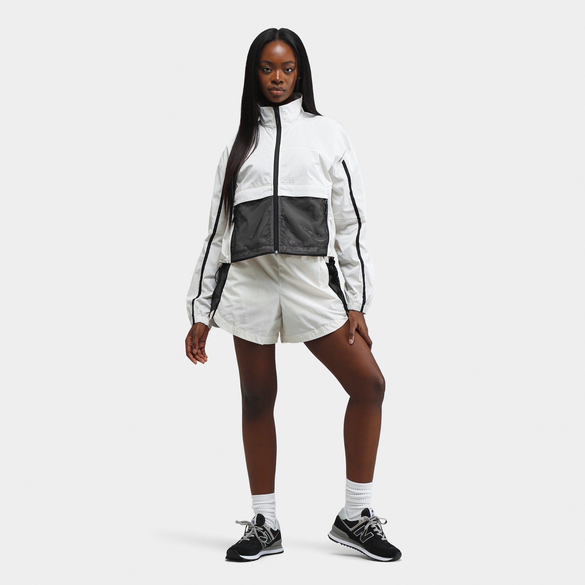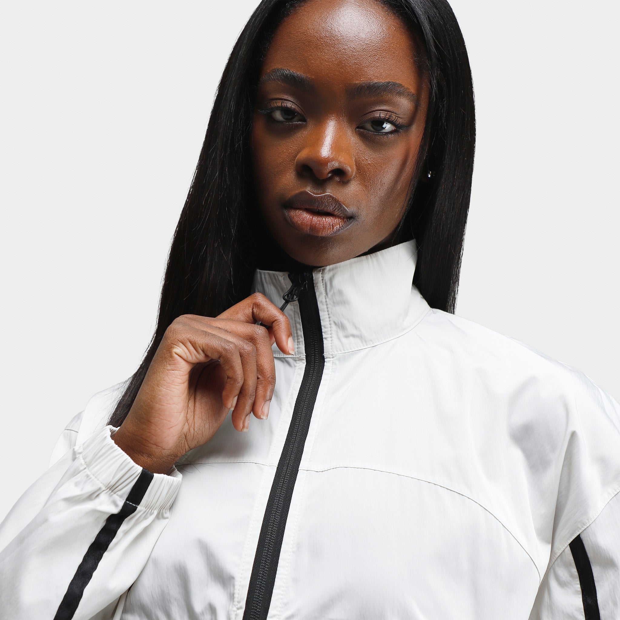 - Zip-up closure with raised collar and elastic cuffs