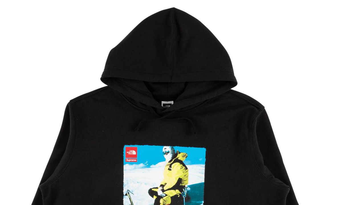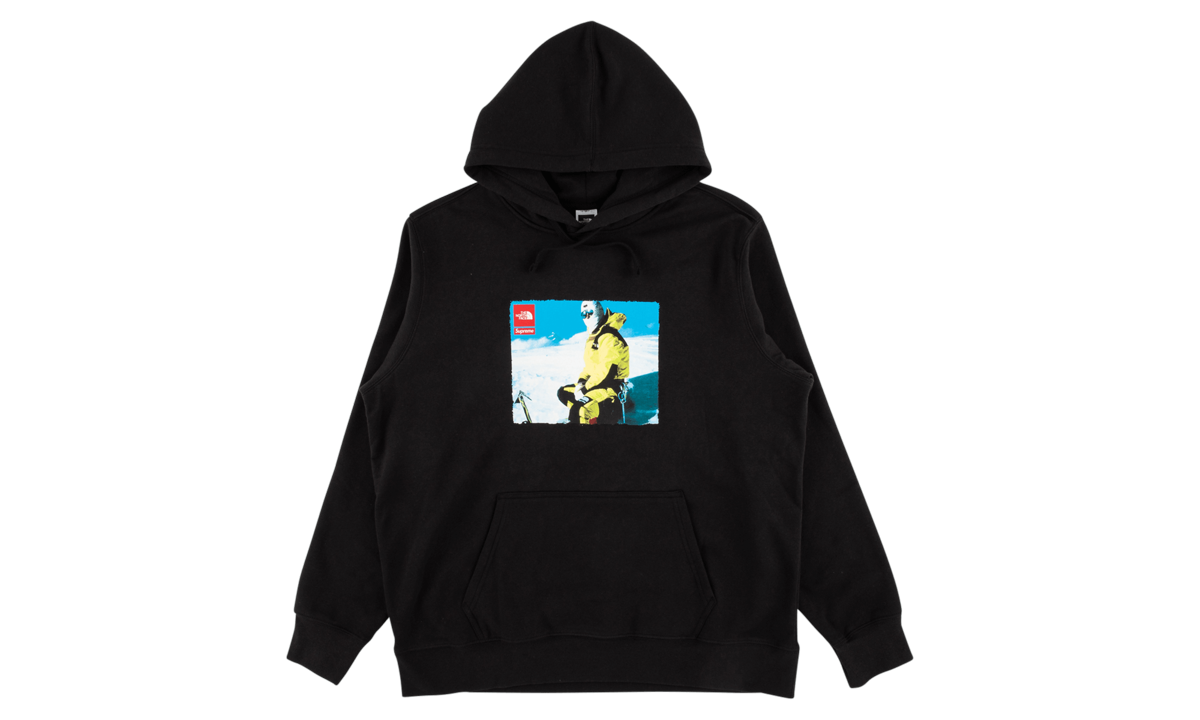 The North Face x Supreme Photo Hooded Sweatshirt captures the outdoor exploration mission of The North Face and the laid-back vibe of Supreme. A bright graphic on the chest depicts a fully geared-up mountain climber perched in the snow, and both logos brand the upper left corner of the graphic. Created with a relaxed fit, this black hoodie is made of 100% cotton. The North Face x Supreme Photo Hooded Sweatshirt is best paired with a tee underneath and relaxed pants or jeans.